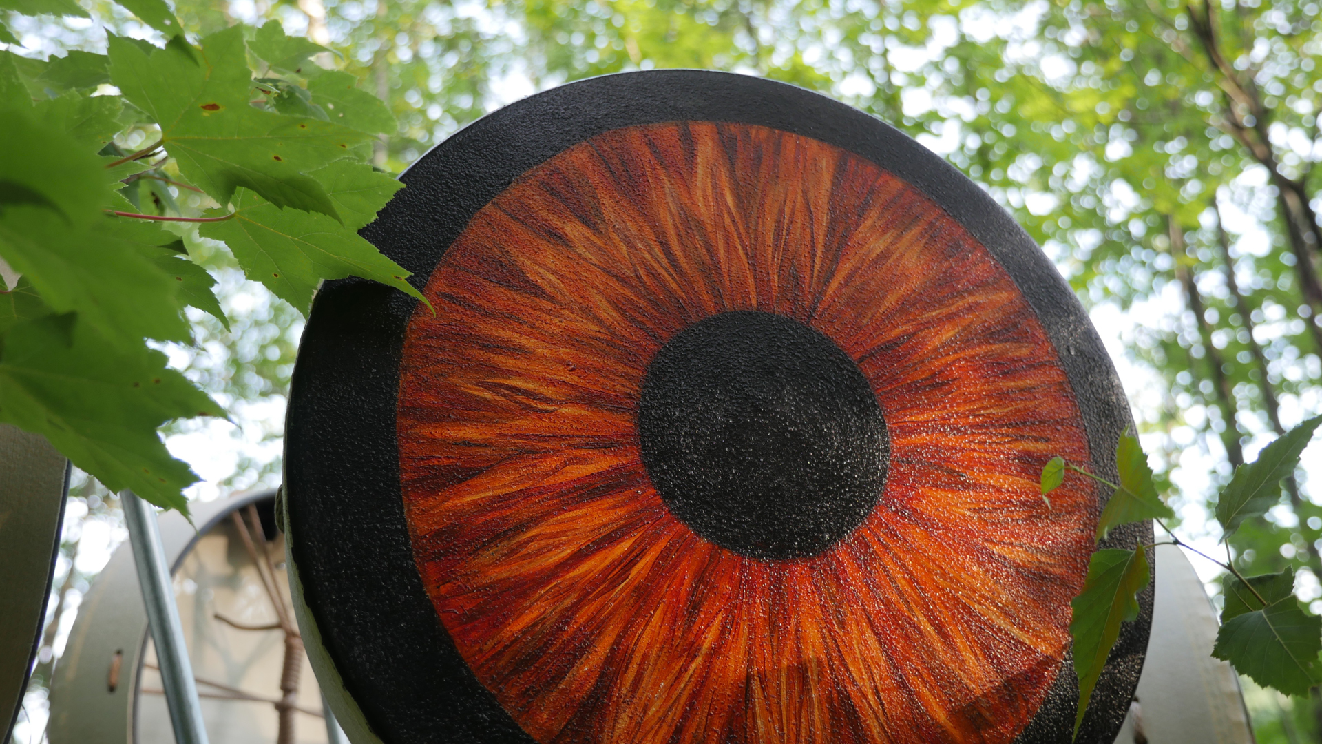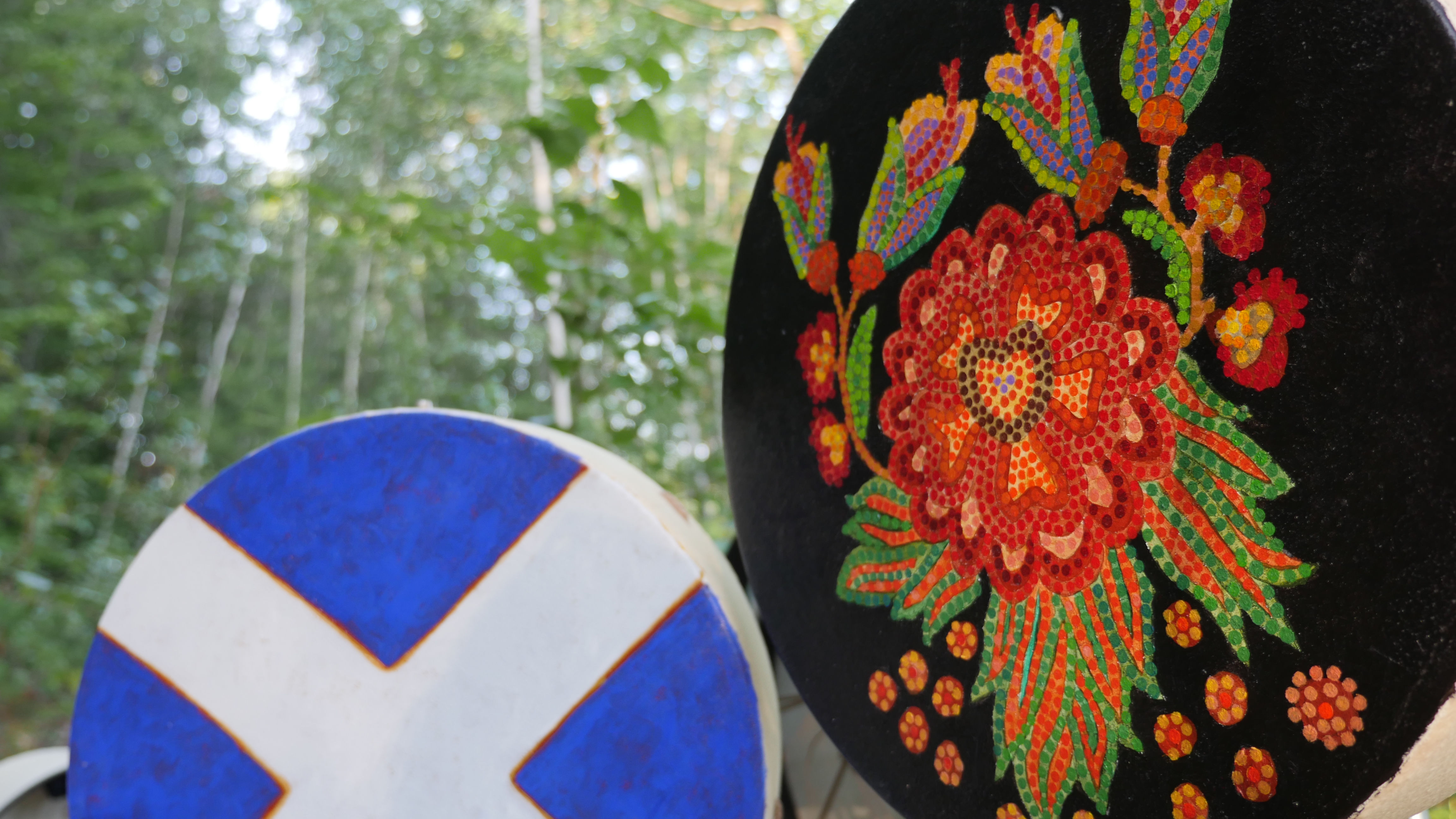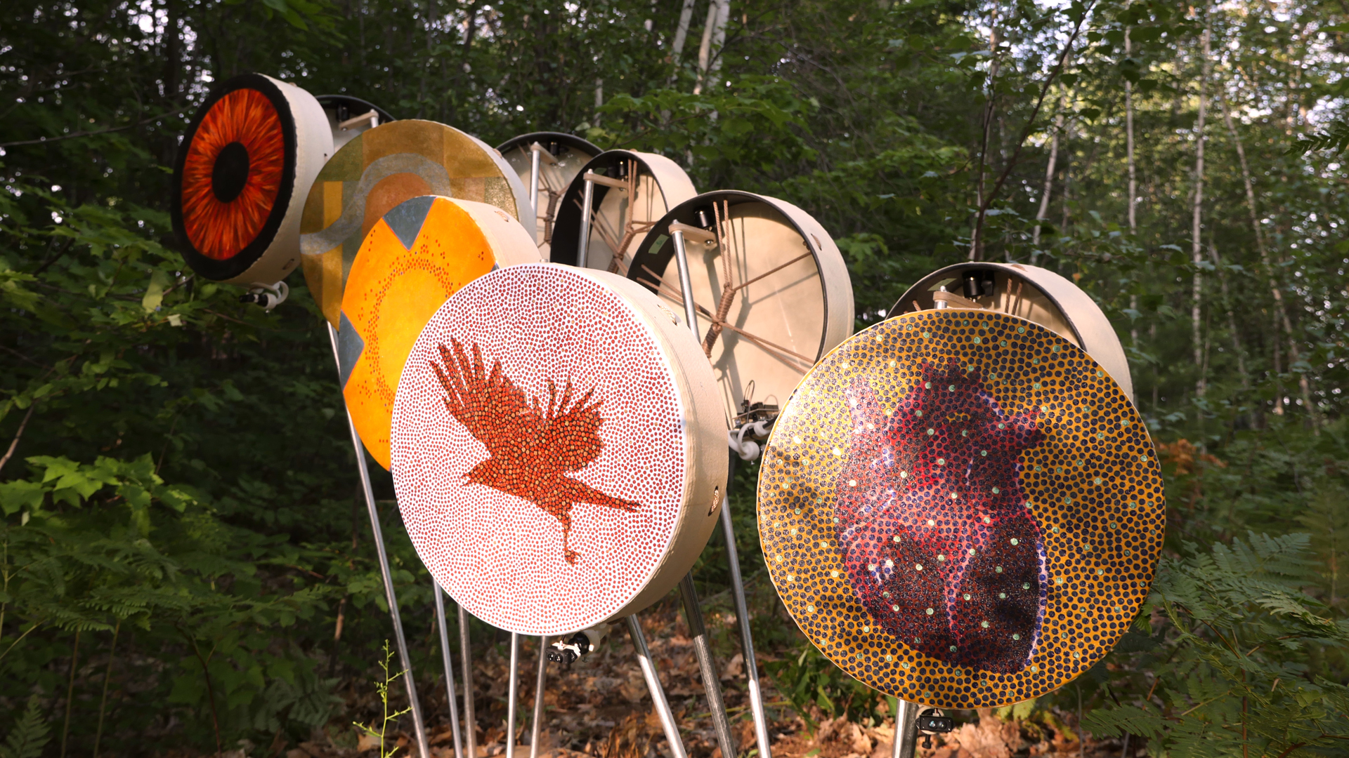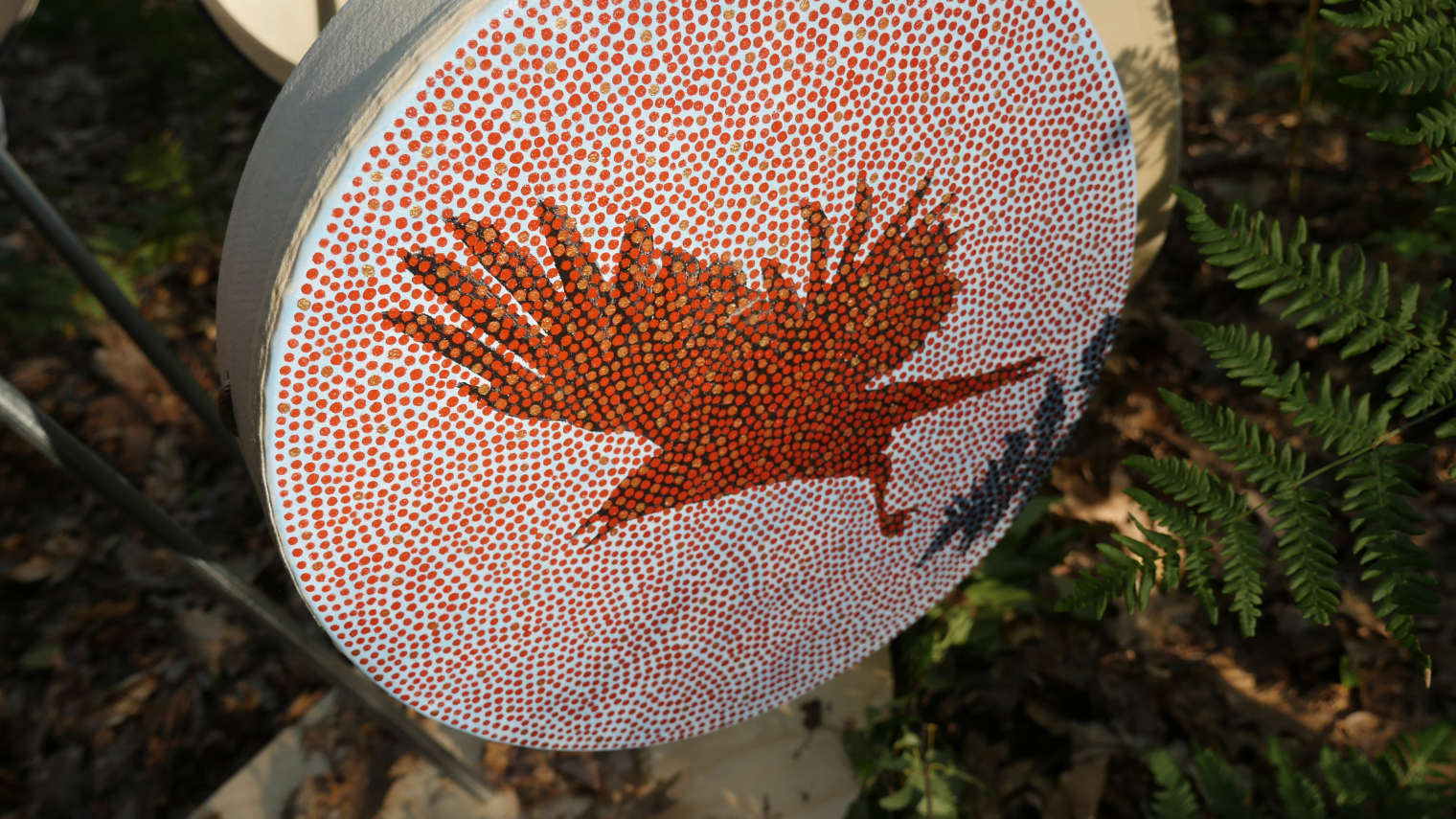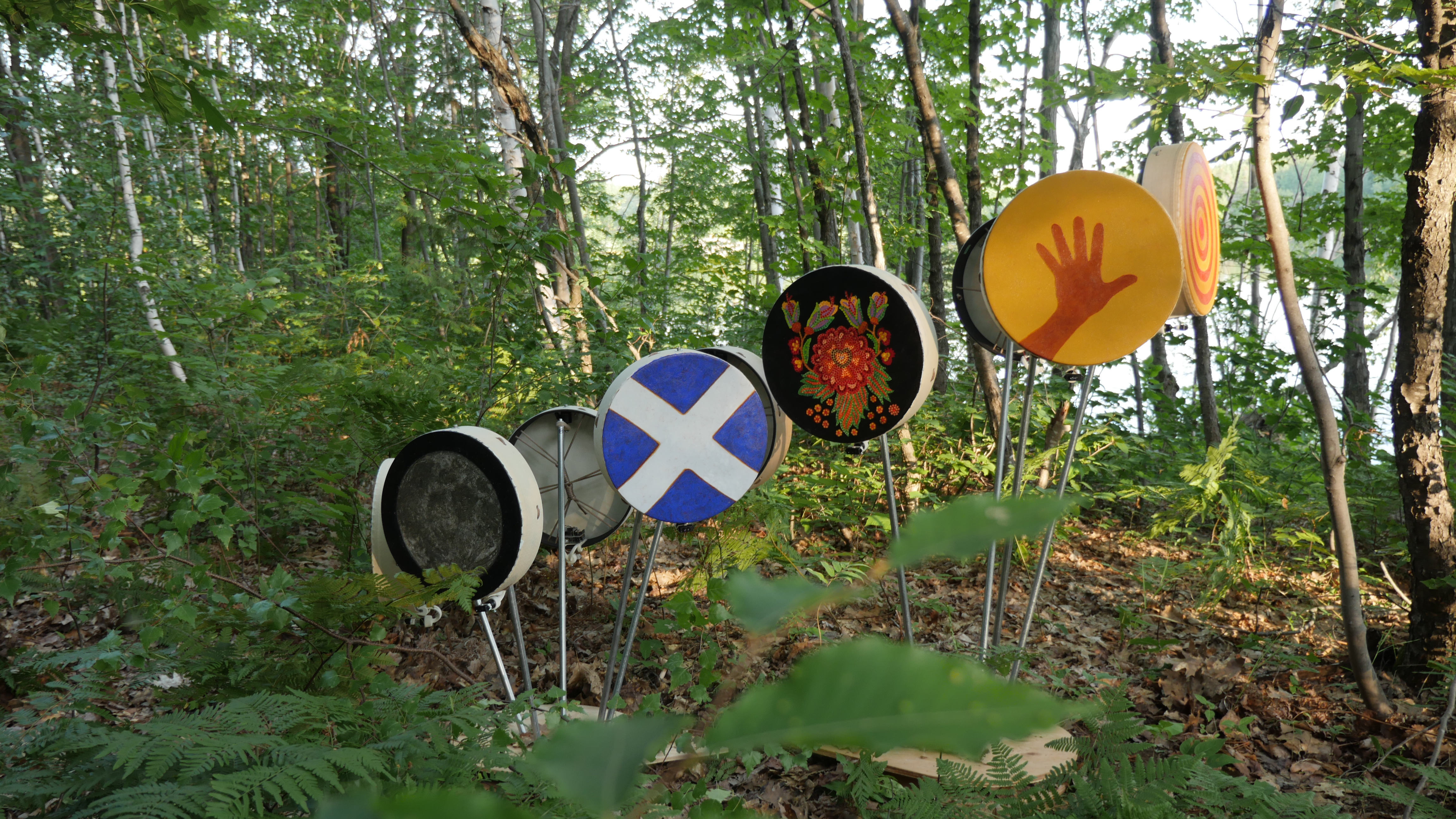 Heart Band is an interactive sound installation in which the sounds of twelve painted hand drums are activated by the motion of visitors. Each drum plays back recordings of David Garneau’s heart beat, its intensity and volume increasing and decreasing in relation to the visitor’s proximity to the drum. The visitors’ movements around the drums creates a unique composition which is heard as the phasing polyrythms of Garneau’s heartbeat emanating from the painted surfaces themselves. Ideally, the drums will be thought of as a spatially triggered ensemble of instruments played by their visitors in a gallery setting or by dancers in the context of a concert performance.
